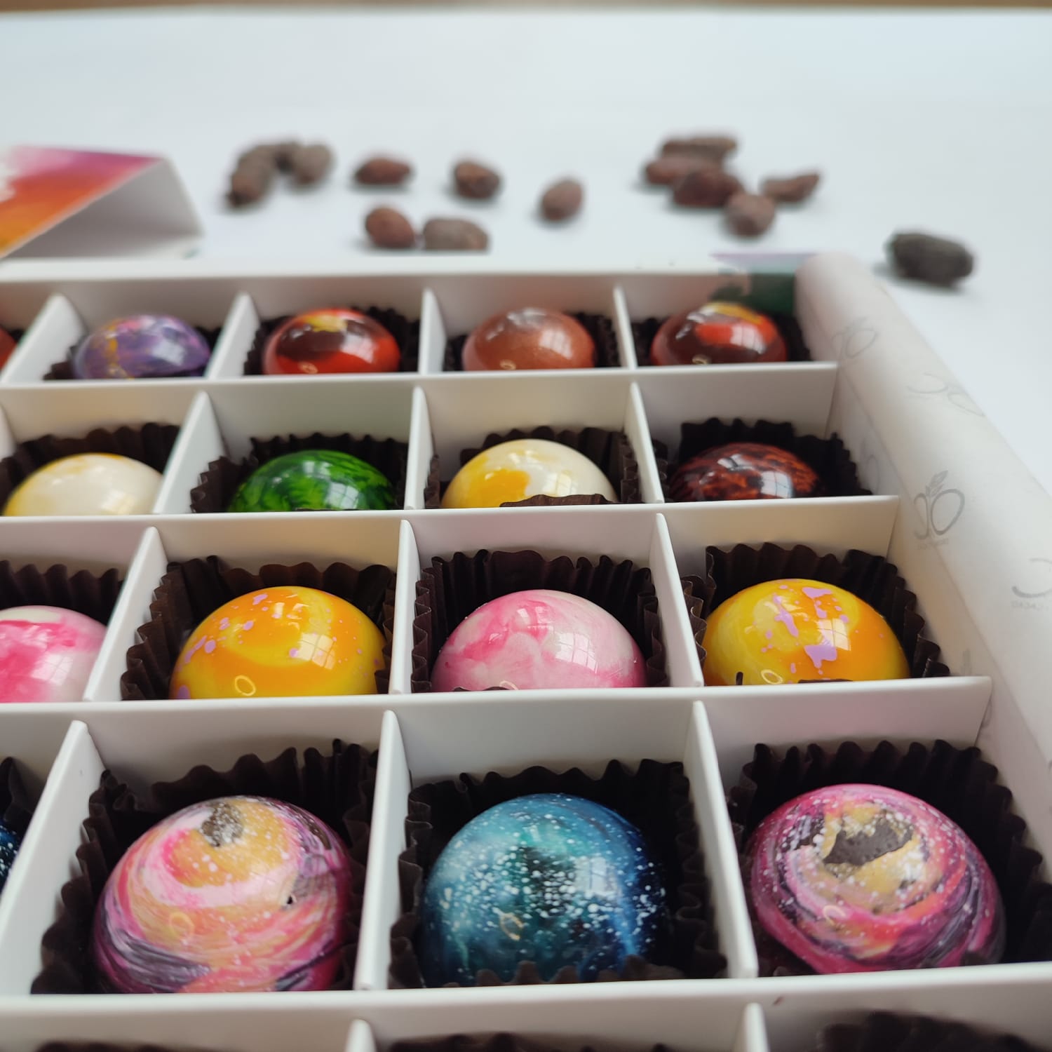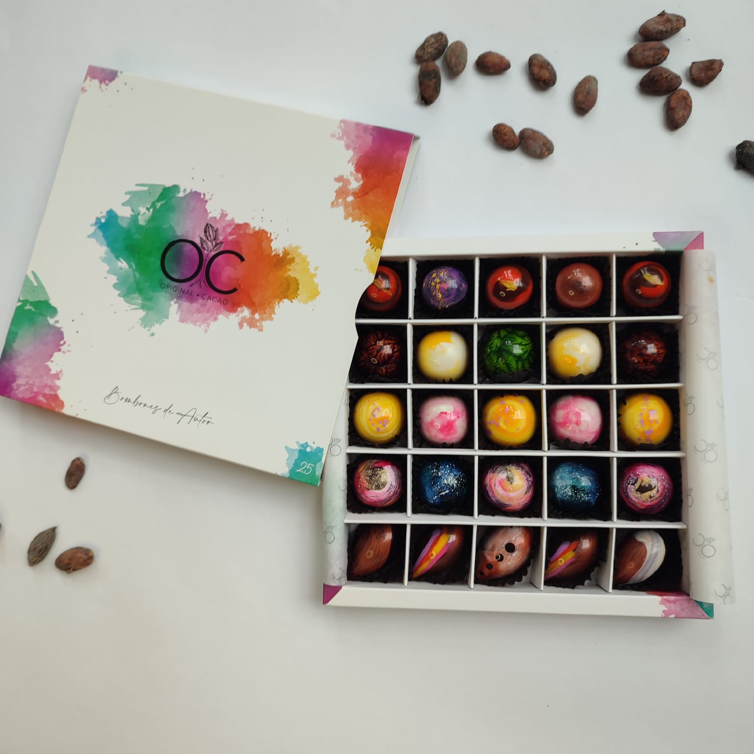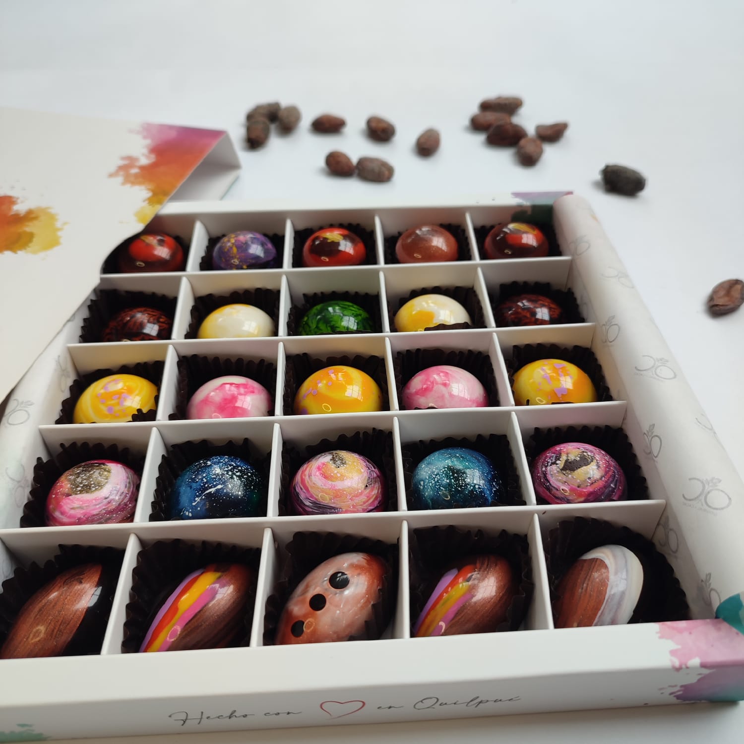 DESCRIPCION: CAJA DE FINOS BOMBONES SURTIDOS, PINTADOS DELICADAMENTE A MANO, CON RELLENOS DE ELABORACION PROPIA. ELABORADOS CON CHOCOLATE BITTER 56%CACAO Y CHOCOLATE BLANCO 31%CACAO. LOS RELLENOS DE ACUERDO A STOCK DISPONIBLE.