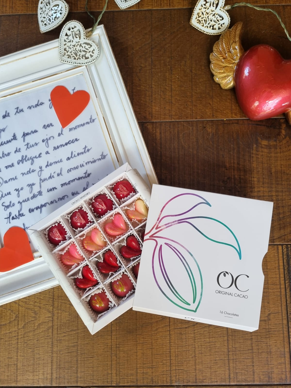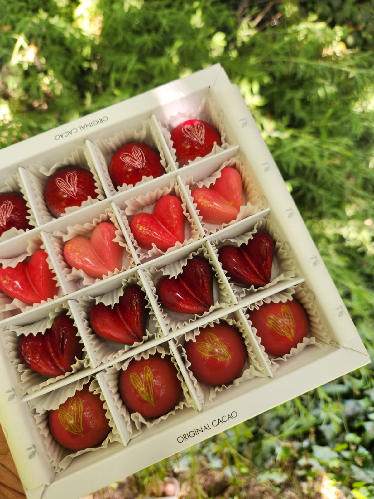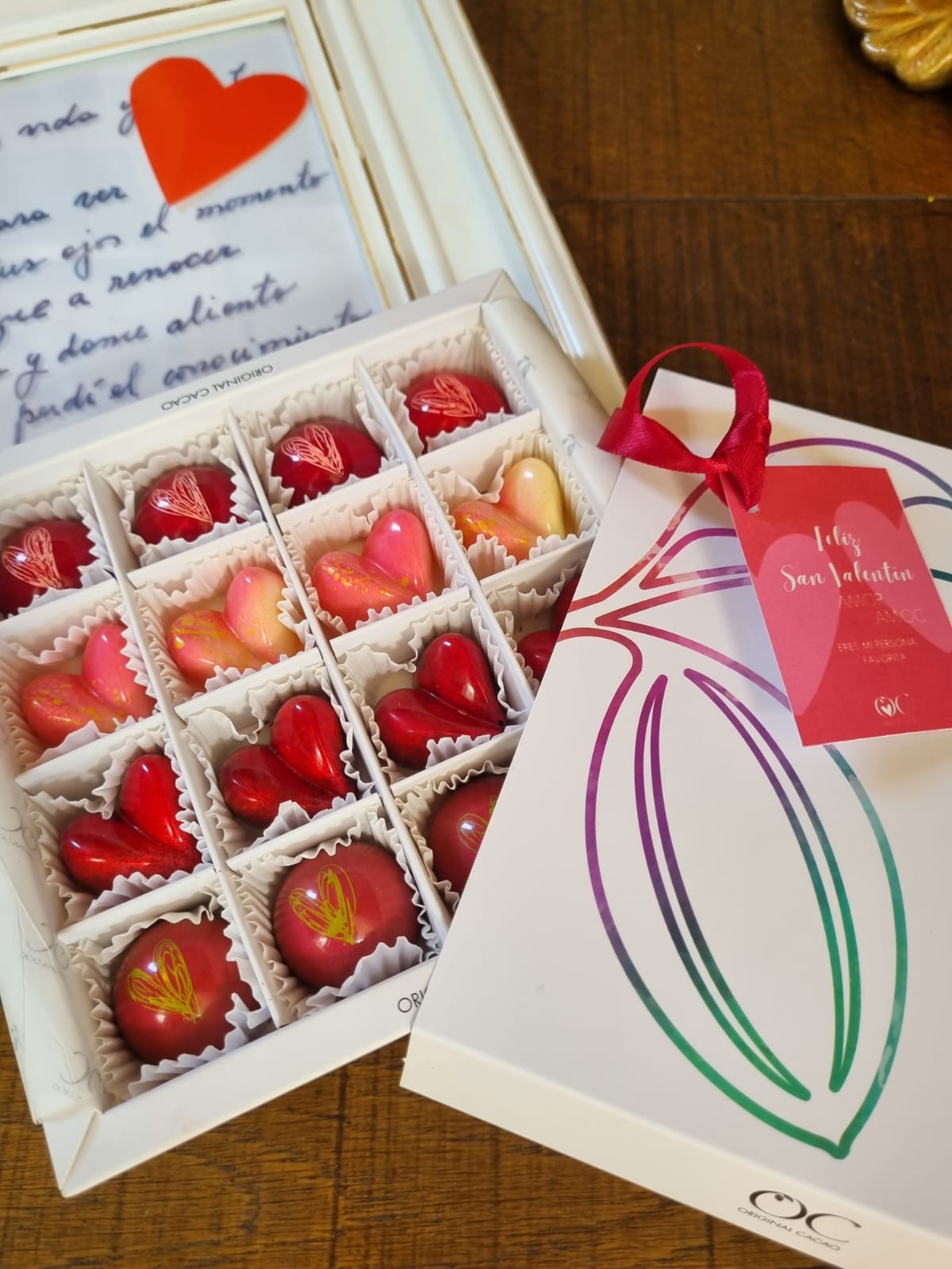 Disfruta San Valentín con estos deliciosos sabores que trae nuestra caja de 9 bombones, que contiene en su interior bombones en casquillo de chocolate bitter 56% cacao relleno de coco tipo prestigio, relleno de fresa con un toque de espumante y el relleno Dubai que es tendencia, elaborado con una crema de pistacho y masa filo y por supuesto nuestro infaltable bombón de maracuyá en casquillo de chocolate blanco 31%cacao. recuerda que puedes incluir un hermoso ramo de flores en tu compra para hacer el match perfecto.
