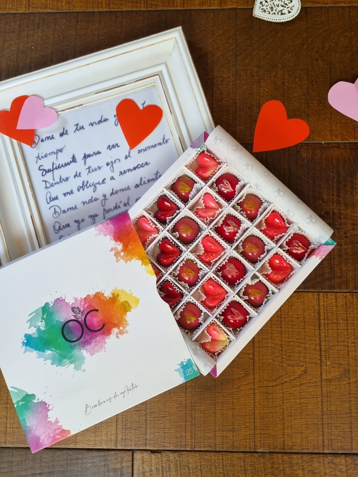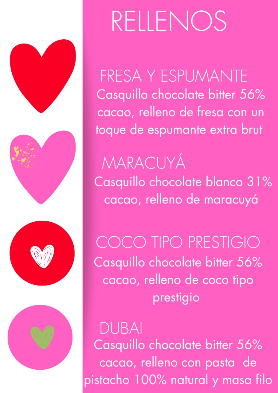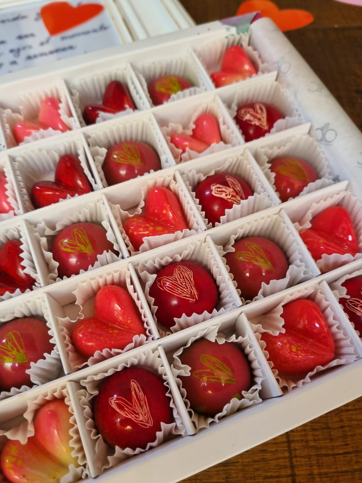 Disfruta San Valentín con estos deliciosos sabores que trae nuestra caja de 9 bombones, que contiene en su interior bombones en casquillo de chocolate bitter 56% cacao relleno de coco tipo prestigio, relleno de fresa con un toque de espumante y el relleno Dubai que es tendencia, elaborado con una crema de pistacho y masa filo y por supuesto nuestro infaltable bombón de maracuyá en casquillo de chocolate blanco 31%cacao. recuerda que puedes incluir un hermoso ramo de flores en tu compra para hacer el match perfecto.